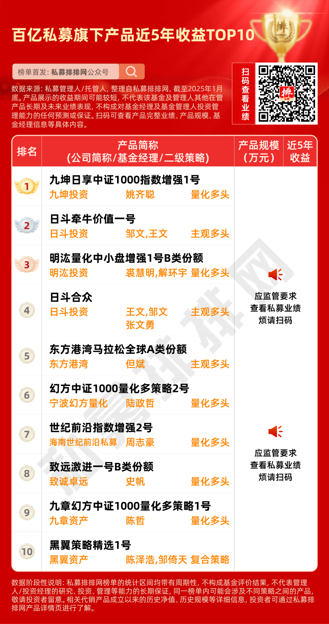 近5年10强:九坤投资夺得第1!宁波幻方量化、九章资产上榜