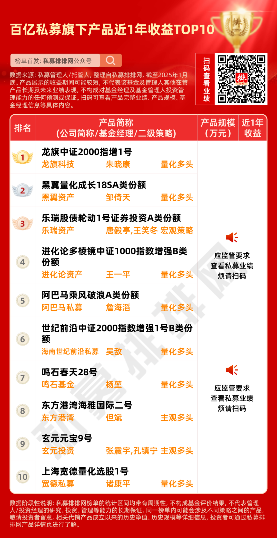收益位居前5的产品分别由龙旗科技朱晓康、黑翼资产邹倚天、乐瑞资产唐毅亭和王笑冬、进化论资产王一平、阿巴马私募詹海滔管理。