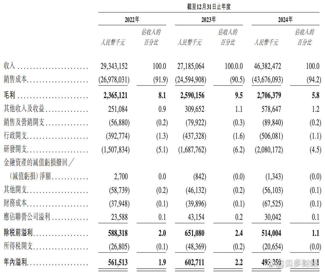 业绩方面,龙旗科技2022年、2023年和2024年的营收分别约为人民币293.43亿元、271.85亿元和463.82亿元,毛利分别约为23.65亿元、25.90亿元和27.06亿元,净利润分别约为5.62亿元、6.03亿元和4.93亿元。