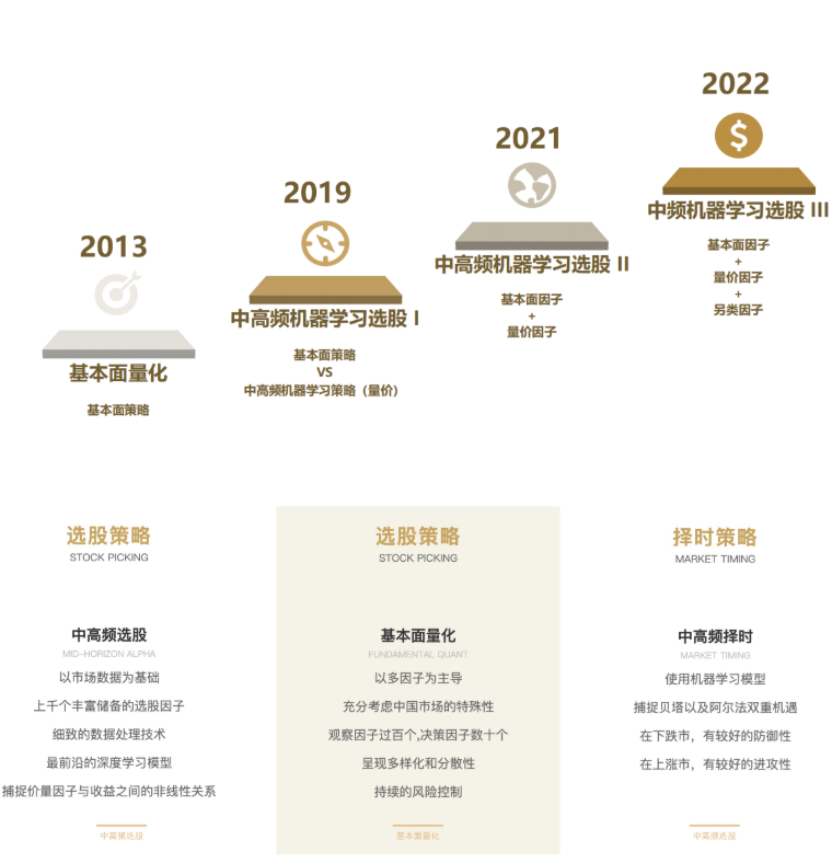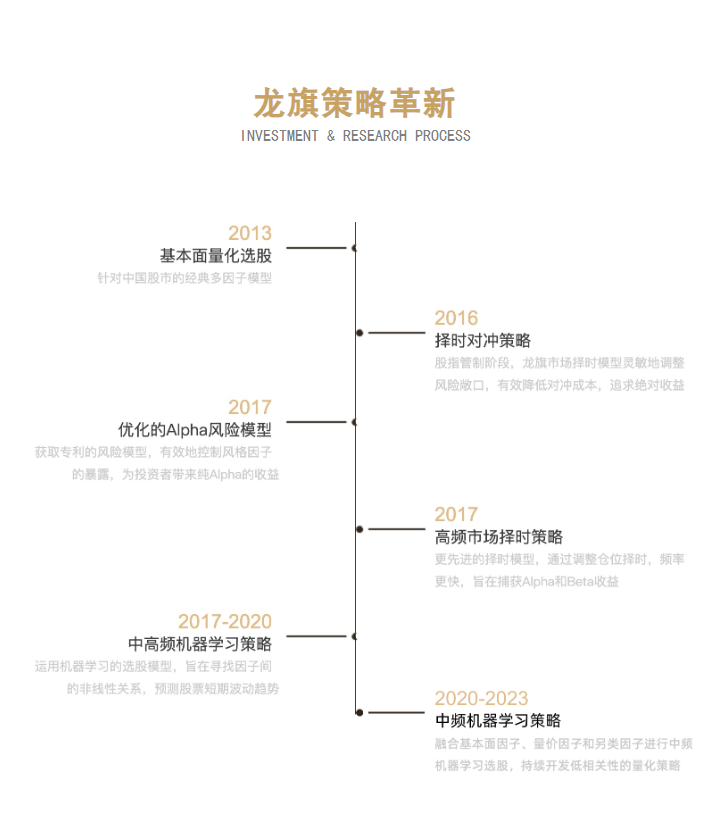 前龙旗选股策略增添运用人工智能、机器学习的中高频策略,以依据价量类、资金流类、市场情绪类等信息,捕捉大多价量因子与证券价格未来走势之间的非线性关系,从而获得超额收益。需要强调的是,龙旗所有策略都是程序化交易,基于获得专利的自主研发的智能化的投资组合管理系统、交易系统。从2017年后,风险控制模型不断优化,自主研发的风控系统也已获得专利。目前龙旗的投资子策略丰富且策略容量较为充裕。龙旗科技以研究为基石,强调持续创新和严格的风控。在量化领域不断探索精进,从早年关注alpha到灵活捕捉beta机会再到严格控制sigma策略风险。龙旗追求的是在不同的市场环境下,都能迭代开发出适合当下市场的稀缺策略,成为量化领域的长跑者。