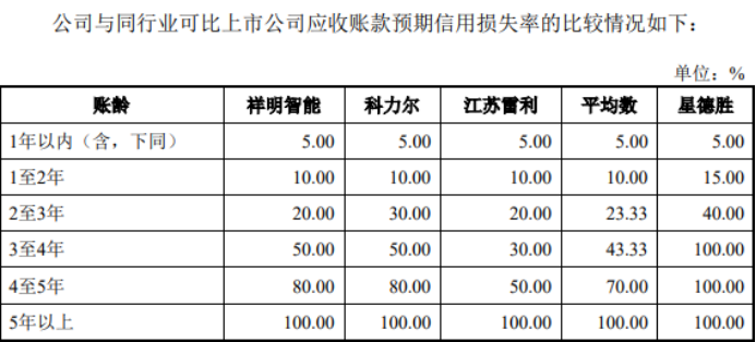 不过,如果与同行业上市公司应收账款信用损失率比较的话,星德胜则在1-2年以及其后都远远大于行业平均值水平。