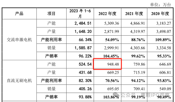 招股书披露,2022年,公司直流无刷电机产能利用率仅为70.56%,2023年1-6月的产能利用率也仅为82.30%。
