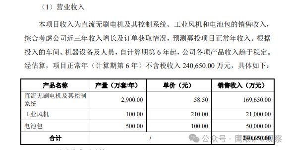 据招股书披露,“年产3,000万套无刷电机及控制系统、500万套电池包扩能项目”的总投资额为65,644.15万元,其中建设投资为58,837.03万元,铺底流动资金为6,807.12万元;建设投资中设备购置费为31,247.94万元。