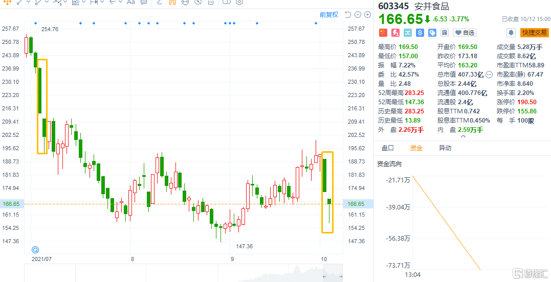 昨日吞下一个跌停板之后,今日,火锅底料大白马安井食品再次低开低走,盘中一度跌近9个点。截至收盘跌近4%,现报166.65元,成交额8.6亿元,最新总市值407亿元。