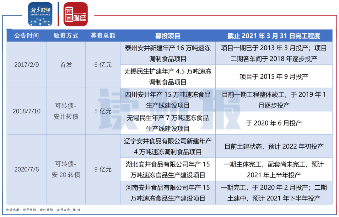 值得一提的是,从前次“安20转债”募投项目的实施情况来看,截至2021年6月末,辽宁项目募集资金使用进度仅有50.87%。在尚未完工的情况下,本次定增募投计划再次涵盖辽宁安井新建年产14万吨速冻食品项目、辽宁安井速冻调制食品加工生产线技术改造项目,因此证监会曾要求公司说明再次投入辽宁项目的原因及必要性。