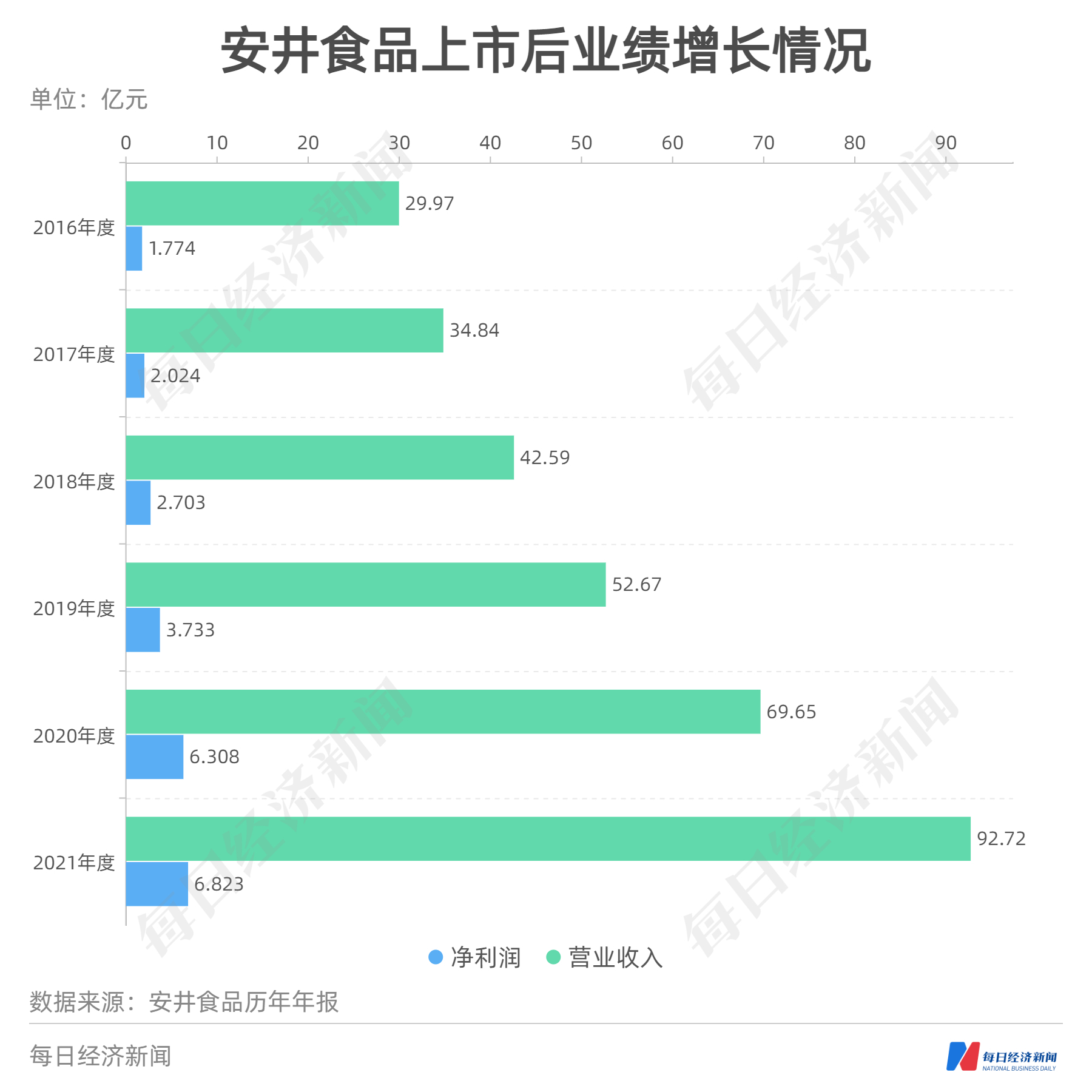 据安井食品2017年~2021年年报数据,上市五年来,安井食品经营业绩呈现持续增长态势,营业收入从34.84亿元增长至92.72亿元,复合增长率达28%;净利润则从2.02亿元增长至6.82亿元,复合增长率近36%;两者指标均高于同业平均水平,也高于公司上市前的增速。