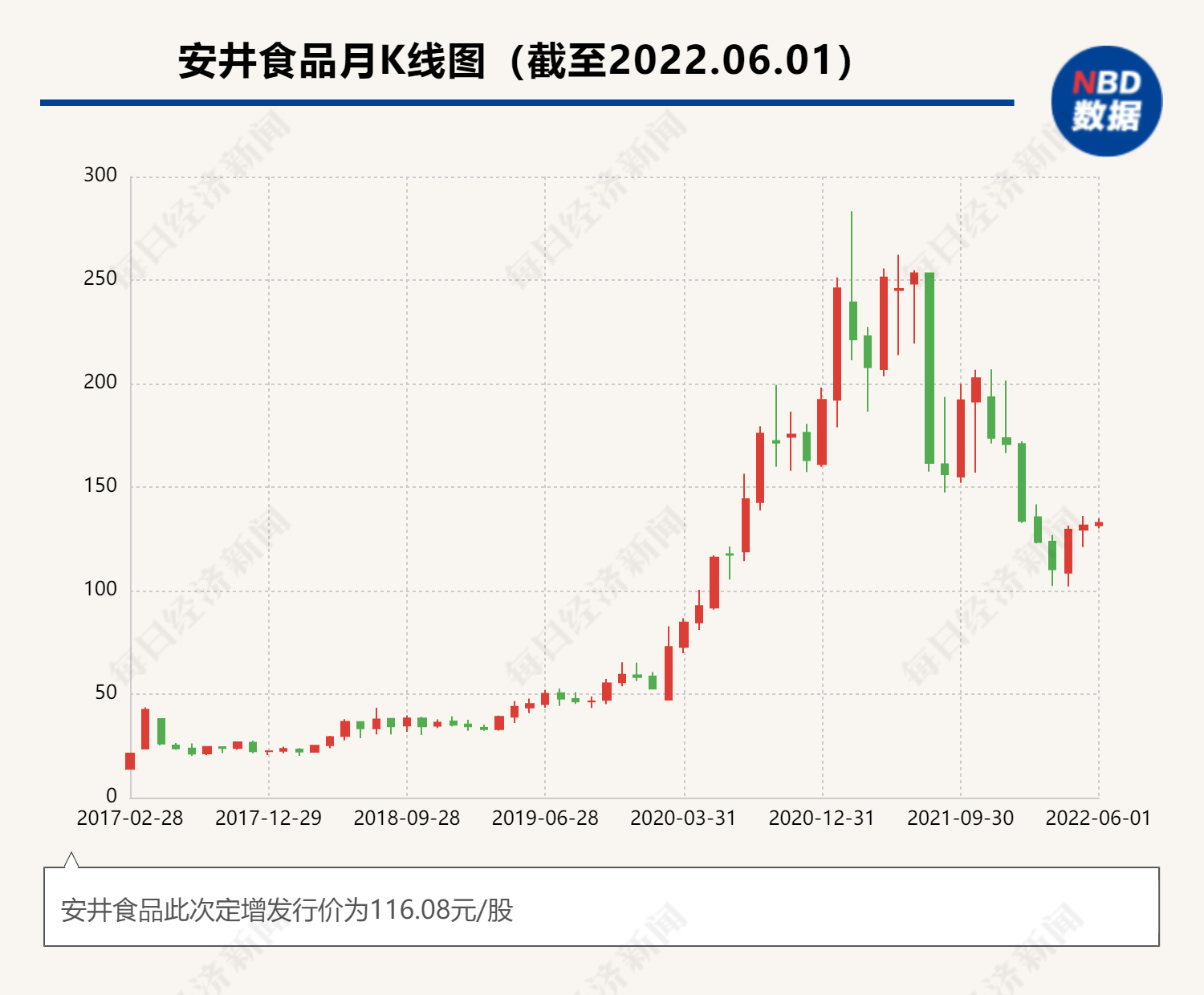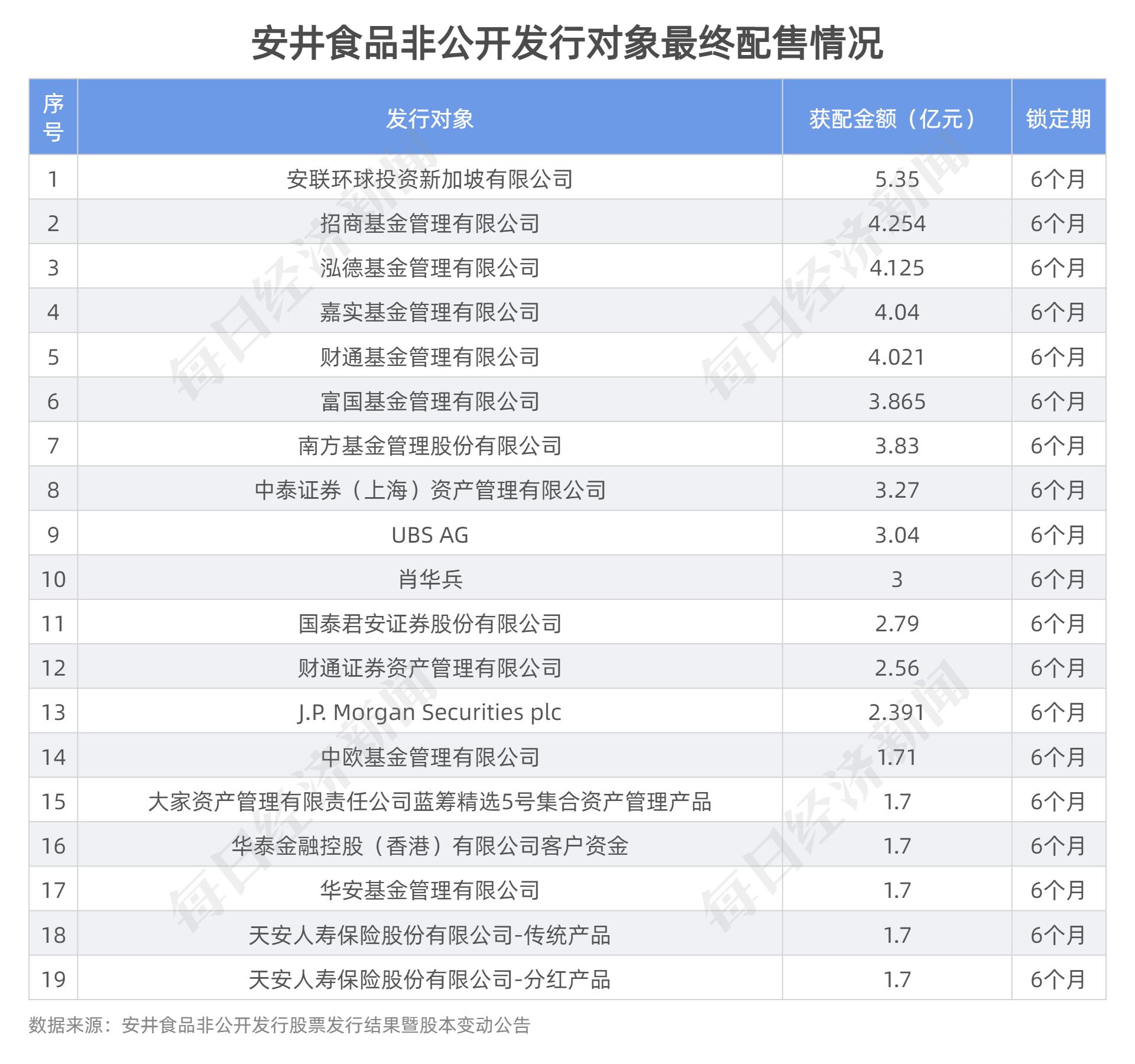 今年3月,速冻龙头安井食品(603345,SH)定增落地,上市公司以116.08元/股的价格向19名发行对象非公开发行4888.49万股股票,募得资金56.75亿元。