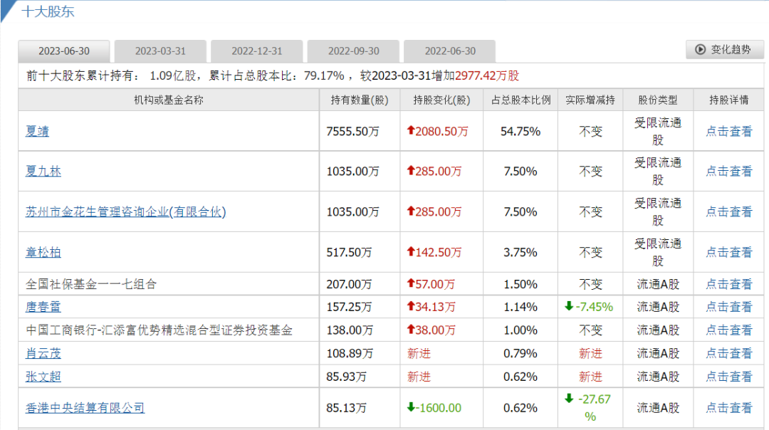 截至2023年6月30日,公司第一大股东为创始人夏靖,直接持有755.50万股,占总股本比54.75%,间接通过苏州市金花生管理咨询企业(有限合伙)持有5.63%股份,合计持有60.38%股份;第二大股东为夏靖表兄夏九林,持有1035万股,占总股本比7.50%。