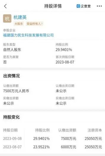 除了上述谜之操作,新进大股东杭建英的迅速崛起也吸引眼球。查询显示,今年8月7日其才首次入股国力民生。