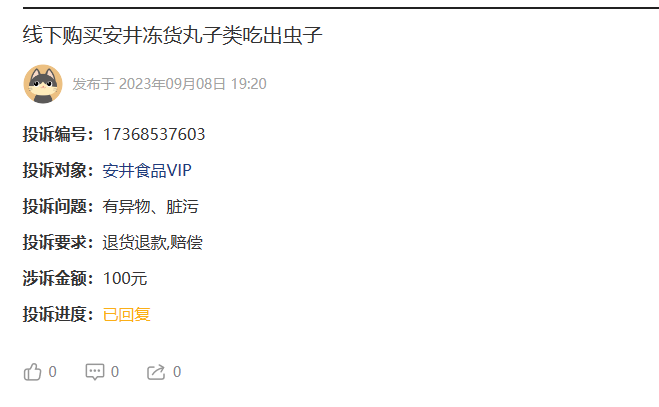 如9月8日,投诉编号17368537603称,线下购买的安井冻货丸子类吃出虫子;