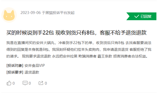 9月6日,投诉编号17368511410显示,一消费者在直播间买的安井火锅丸,冲着到手22包下的单,收到货后只有8包,去找客服要说法得到的回复是本身就是8包。该消费者怀疑他们挂羊头卖狗肉,遂申请退货,但客服拒绝了请求.......