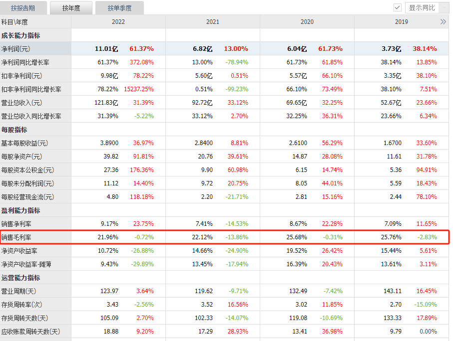 但若深入基本面,一些隐忧短板也不能忽略。2020年至2022年,安井食品销售毛利率25.68%、22.12%、21.96%,连续负增。同期,千味央厨毛利率为21.71%、22.36%、23.41%,呈递增态势。同样市场环境,一升一降间,安井食品是否该反思了?