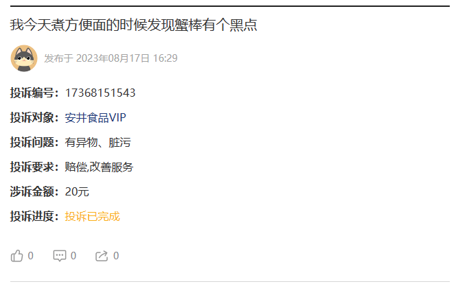 8月17日,投诉编号17368151543称,在超市购买安井生产的蟹棒,当天煮方便面时发现蟹棒有个黑点。