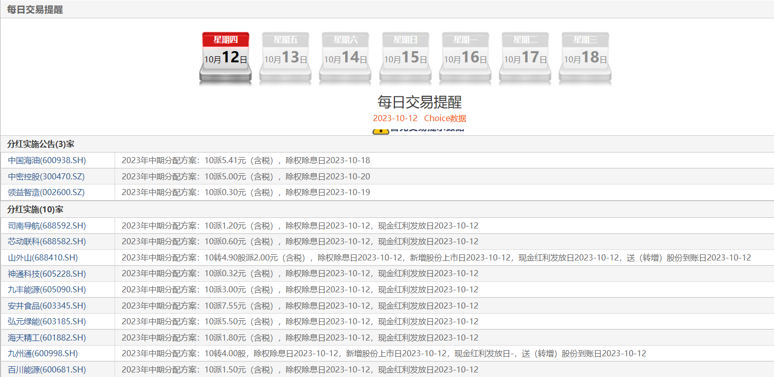 据Choice数据显示,今日(10月12日)预计共有包括司南导航、芯动联科、山外山、神通科技等在内的10家上市公司完成半年度分红。其中,安井食品每10股派发现金红利7.55元(含税),现金分红总额预计为2.21亿元;弘元绿能每10股派发现金红利5.50元(含税),现金分红总额预计为3.18亿元。
