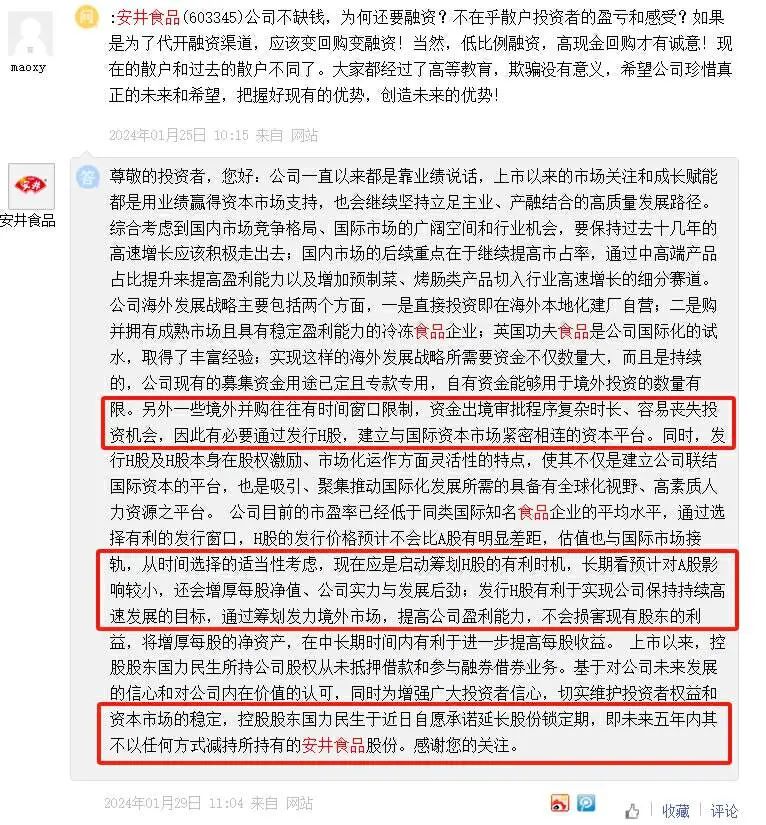 在股价暴跌几日后,1月29日,安井食品在投资者互动平台“长篇大论”的回复为何海外上市。