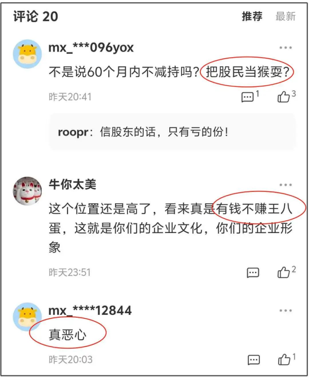 另外,公司只说了大股东承诺不减持,高管没有承诺啊?有股民忍不住痛骂道,这**就是玩“文字游戏”,太**了!嘴上说的全是“看好”,行动上全是“套现”!