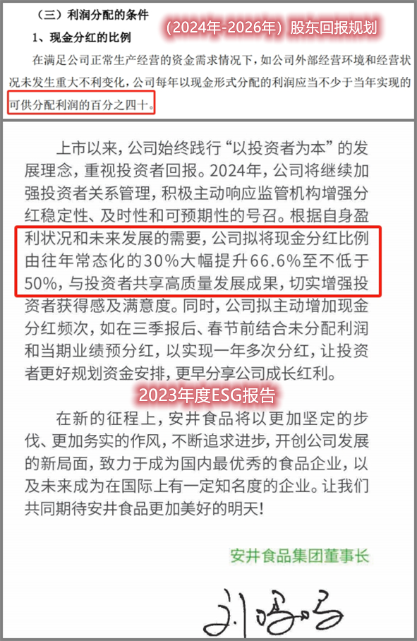 另外,在2024-2026年股东回报规划中,安井食品明确提出每年现金分红不低于当年可供分配利润的40%。问题又来了,在2023年度ESG报告中,董事长刘鸣鸣明确提到,公司拟将现金分红比例大幅提升到不低于50%。