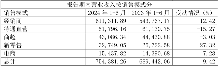 从销售模式分析,经销商仍然占绝对比重,今年上半年营收61.13亿,同比增长12.42%;另外,新零售渠道表现亮眼,较去年同期增长27.32%,增速在所有模式中排名第一。