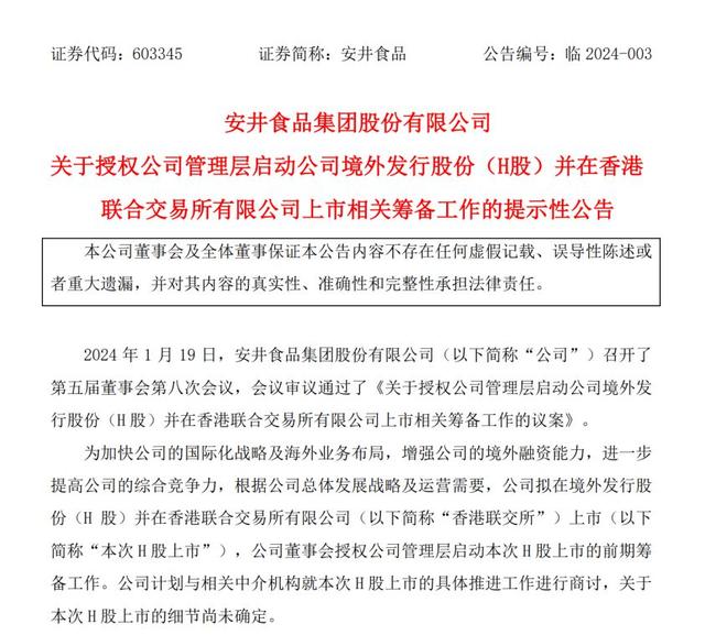 据安井食品会议决议公告显示,为加快安井食品的国际化战略及海外业务布局,增强公司的境外融资能力,进一步提高公司的综合竞争力,根据公司总体发展战略及运营需要,董事会同意公司在境外发行境外上市股份(H 股)并在香港联交所主板上市。