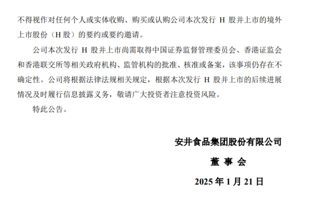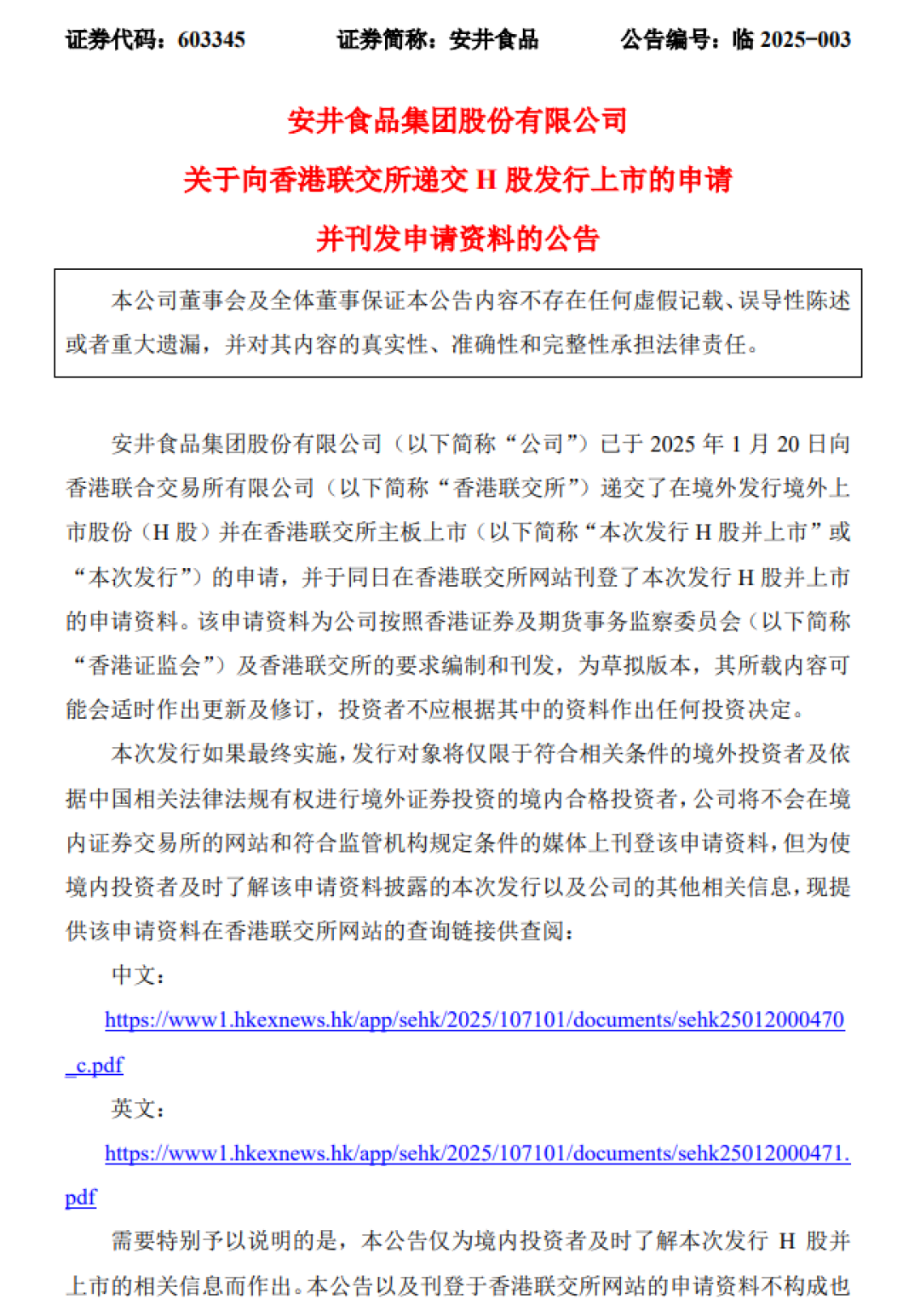 安井食品于2025年1月20日正式向香港联交所递交了在境外发行境外上市股份(H股)并在香港联交所主板上市的申请。