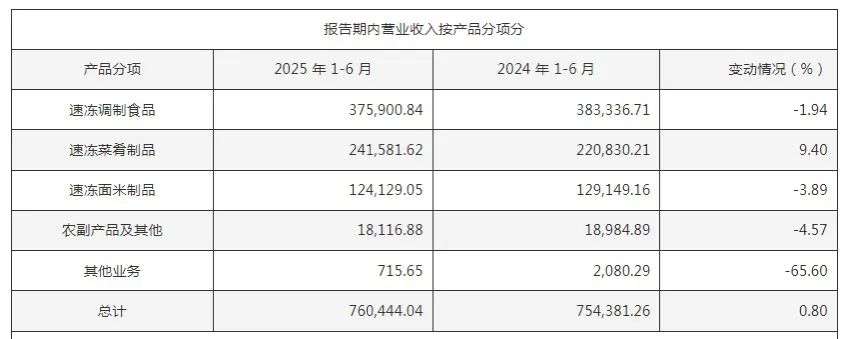 但从上半年表现来看,公司业务结构分化,仅预制菜(速冻菜肴制品)实现增长,其余品类销售均显低迷。
