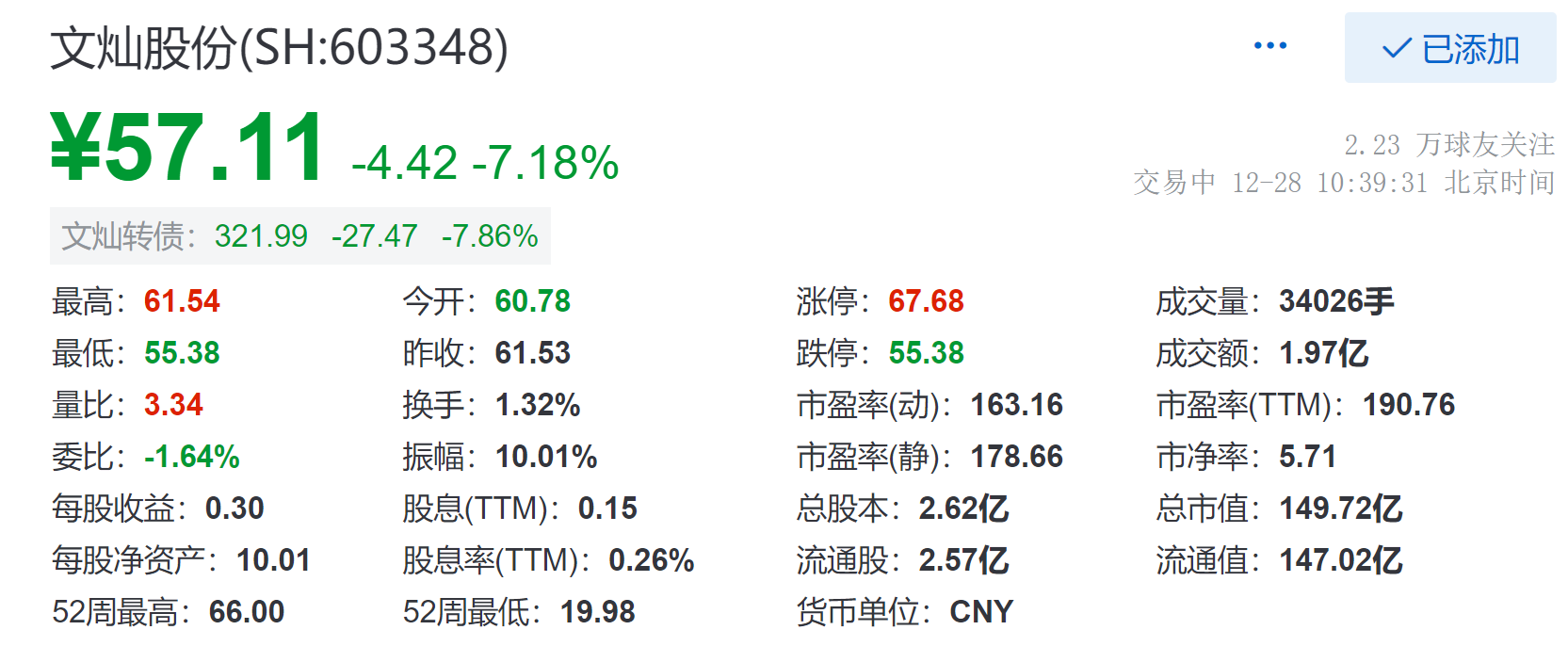 12月28日,截至10:39,文灿股份(SH:603348)下跌7.18%,现报57.11元,成交额为1.97亿元,总市值为149.72亿元。
