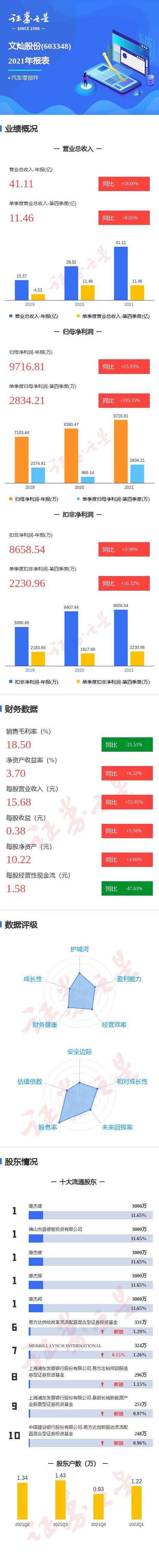 文灿股份2021年报显示,公司主营收入41.12亿元,同比上升58.0%;归母净利润9716.82万元,同比上升15.95%;扣非净利润8658.54万元,同比上升2.99%;其中2021年第四季度,公司单季度主营收入11.47亿元,同比上升0.05%;单季度归母净利润2834.22万元,同比上升193.35%;单季度扣非净利润2230.96万元,同比上升16.32%;负债率54.18%,财务费用8131.11万元,毛利率18.5%。