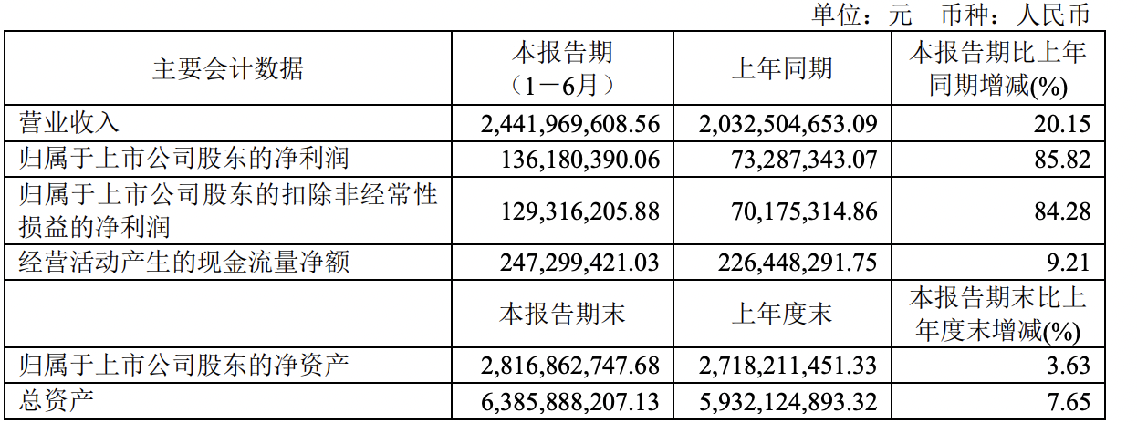 据悉,报告期内,文灿股份营业收入24.42亿元,同比增长20.15%;归属于上市公司股东的净利润1.36亿元,同比增长85.82%;归属于上市公司股东的扣除非经常性损益的净利润1.29亿元,同比增长84.28%;基本每股收益0.53元,同比增长82.76%。