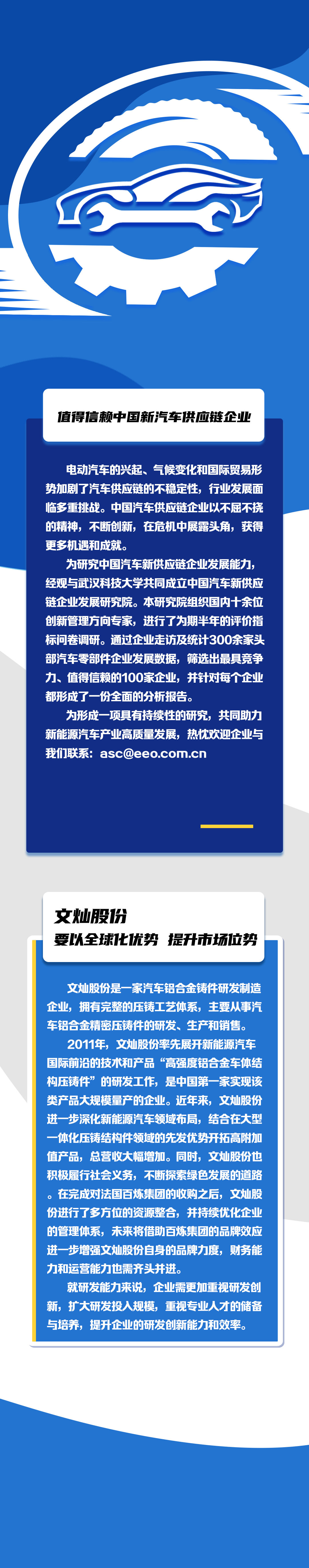 ——品牌的协同效应优势。文灿股份子公司法国百炼集团有着近60年的发展历程,在铝合金铸造汽车零部件领域积累了良好的信誉并形成了独有的品牌优势,在铝合金刹车铸件(刹车主缸和卡钳)领域处于全球领导地位。文灿股份未来可借助百炼集团的品牌优势继续保持这种发展态势,在全球范围内进一步开拓铝制轻量化汽车零部件市场,提高公司品牌及产品服务在国际市场的知名度,巩固行业地位。