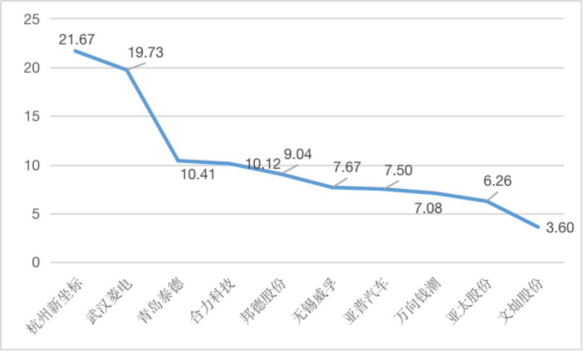 2021年“汽车零部件”赛道企业研发强度和发明专利数情况如表1所示,除武汉菱电(12.12%)、杭州新坐标(7.43%)、浙江万里扬(6.88%)、瑞鹄模具(5.82%)四家企业的研发强度较高,其他企业的研发强度均不足5%。2021年文灿股份的研发强度为2.92%,研发人员拥有的专利数为8件,处于行业靠后位置,研发水平和研发效率距离赛道领先企业还有较大的差距,需要企业增加研发投入,进一步提高企业的创新研发能力。
