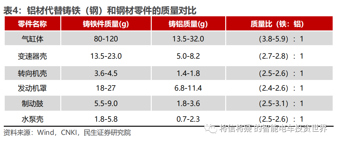 铝合金是现阶段较好的轻量化材料之一。铝合金的性能、密度、成本和可加工性等综合优势突出:1)密度上,高强度钢的密度是7.87g/cm3,而铝合金的密度是2.7g/cm3,传统汽车中车身约占整车重量的30%-40%,用高强度钢替代普通钢材能减重约11%,而如果采用铝合金,减重效果约为高强度钢的2.25倍,镁合金减重效果优于铝,但受限于镁自身化学性质活跃、不如铝合金耐腐蚀,加工生产成本高昂,目前在汽车行业应用较少;2)性能上,铝合金塑性优良,工业生产中的铸、锻、冲工艺均能适用,适于广泛应用于压力铸造工艺,其余材料如镁合金面临价格较高及高温抗蠕变问题,碳纤维是脆性材料,具备高昂成本,难以普及,高强钢凭借其高强度应用于车身关键部位,但减重效果有限;3)性价比方面,铝合金的价格约为高强度钢的6.7倍,镁的价格约为高强度钢的16.7倍。因此在综合性能、成本、制造技术和机械性能等方面都表现出色。铝合金加速代替汽车钢材零部件,例如气缸体、变速器壳、转向机壳、发动机罩等等,绝对减重均可达70kg。当前众多主流车型均采用全铝车身,前后悬架大部分材料也采用铝合金,用铝化程度越来越高,最大程度实现轻量化制造。