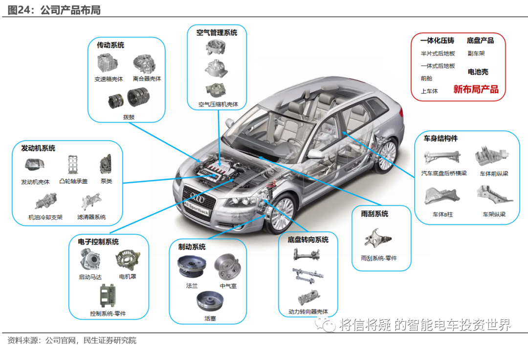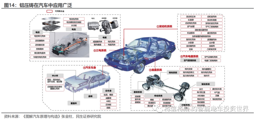 铝压铸件广泛分布在汽车的动力、传动、三电、底盘等系统。铝合金压铸件主要应用在动力系统、底盘系统和车身领域,与燃油车相比,电动车在动力系统、车身、底盘结构件上更加积极采用铝合金压铸件。其中车身结构件是车身构造的框架,涉及产品主要包括后纵梁,A、B、C、D柱,前、后减震器,左、右底大边梁和防火墙、后备箱底板等。