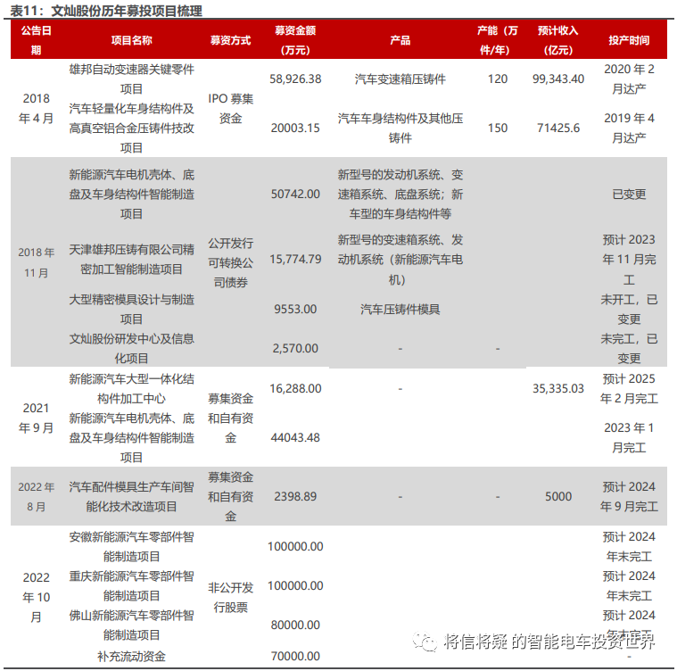 工厂布局全球,募投项目持续扩产。公司在国内有4个工厂,总部位于广东省佛山市,在江苏省南通市、无锡市、天津市设有生产基地,子公司百炼在全球有12个生产基地,分布在墨西哥、中国(武汉、大连、无锡)、法国、匈牙利、塞尔维亚等国家。公司通过法国百炼集团的收购,完成了全球生产基地的布局。2023年5月,公司发布定增,向特定对象发行股票募集资金总额不超过35亿元,用于安徽、重庆、佛山等生产基地建设。据公司公告,项目建设期2年,逐步达产期3年,预计项目建成后第6年完全达产,达产后年度营收为15.28亿元,其中车身结构件及一体化大铸件产能预计为71万套,收入11.88亿元,新能源汽车三电系统核心零部件产能预计为32万套,销售收入3.40亿元,支撑公司后续业绩增长。
