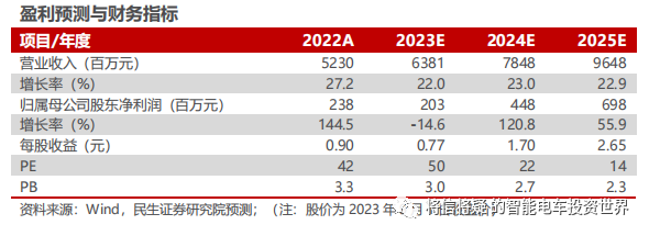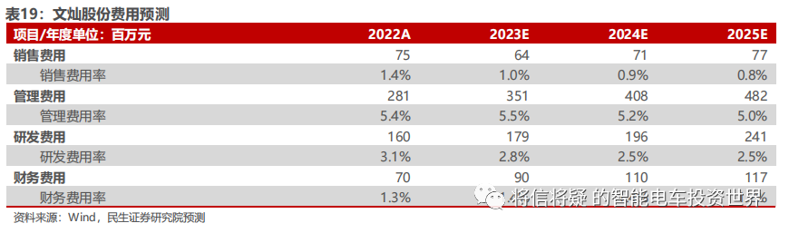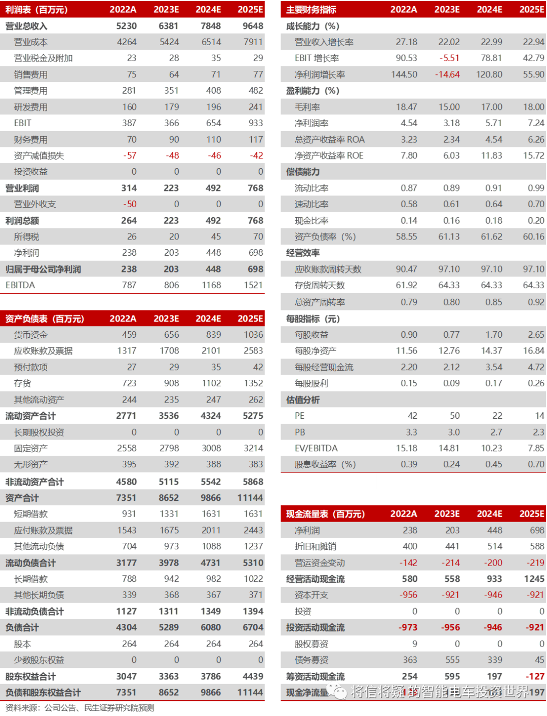 费用上,公司2022年销售费用率/管理费用率/研发费用率/财务费用率分别为1.4%/5.4%/3.1%/1.3%,公司与大客户合作稳定,随着公司营业收入的快速增长,我们预计公司2023-2025年销售费用率分别为1.0%/0.9%/0.8%,保持平稳;2023年受公司工厂增加、管理人员扩张等因素影响,我们预计公司2023年管理费用率为5.5%,随着公司收入规模以及各工厂的陆续投产,我们预计规模化优势下公司2024-2025年管理费用率为5.2%/5.0%;公司一体化压铸件逐步量产,随着公司收入体量逐步增长,我们预计公司2023-2025年研发费用率分别为2.8%/2.5%/2.5%;我们预计公司2023-2025年财务费用率分别为1.4%/1.4%/1.2%。
