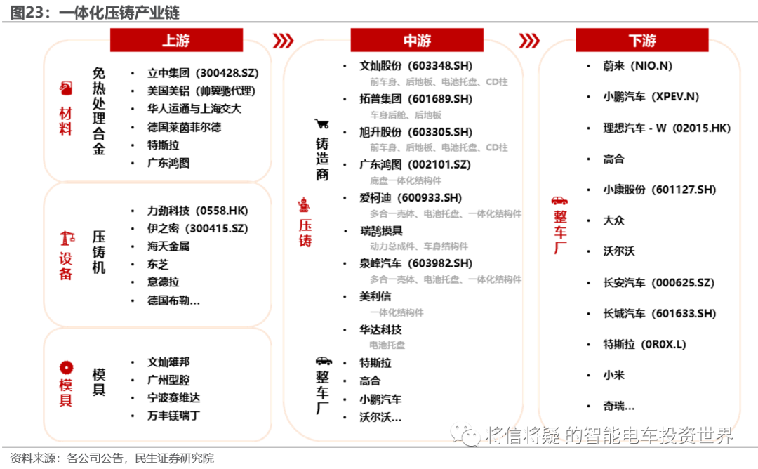 一体化压铸产业链上游由免热处理铝合金材料厂商、压铸机和压铸模具厂商组成,中游为第三方压铸厂和自建产线的整车厂,下游直接对接主机厂。随着行业需求迸发,较多压铸/冲压企业购入大型压铸机布局一体化压铸,产业链逐步扩大。