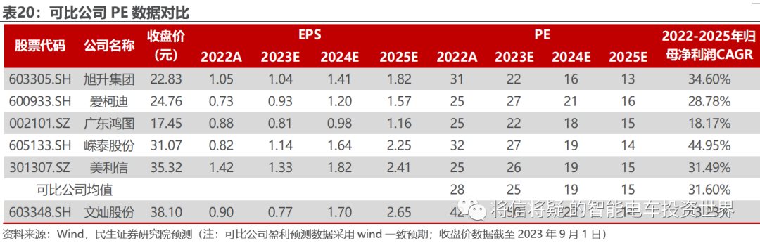1)旭升集团:从事热成型压铸和锻造的精密铝合金汽车零部件和工业铝合金零件的研发、生产、销售,主要产品包括新能源三电壳体等,其控制系统、悬挂系统、电池系统产品与公司业务具有较高可比性;