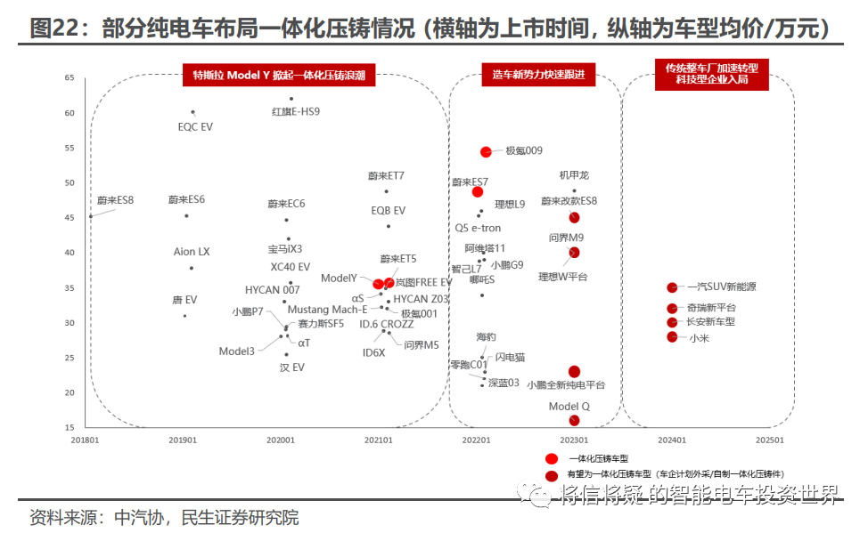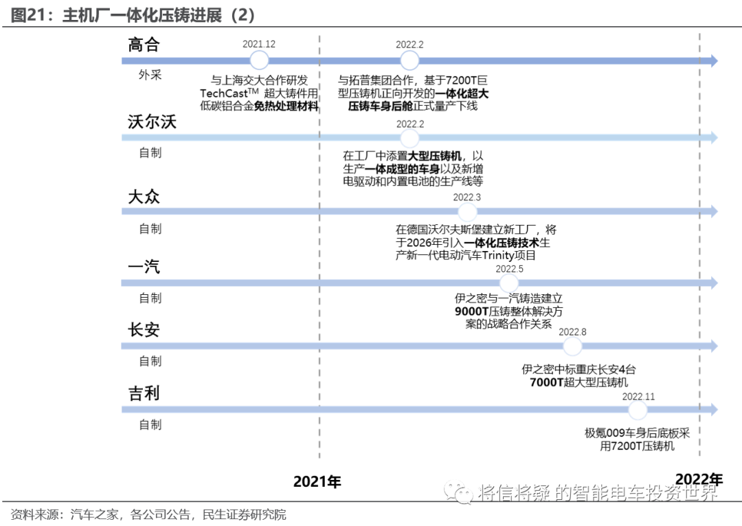 以蔚小理为代表的造车新势力均已为旗下部分30万以上的纯电车或下一代平台布局一体化压铸,一体化压铸车型不断扩充,2024年搭载一体化压铸的车型有望快速放量。结合压铸机引进时间来看,我们预计2024年市场有望迎来一体化压铸车型上市热潮。
