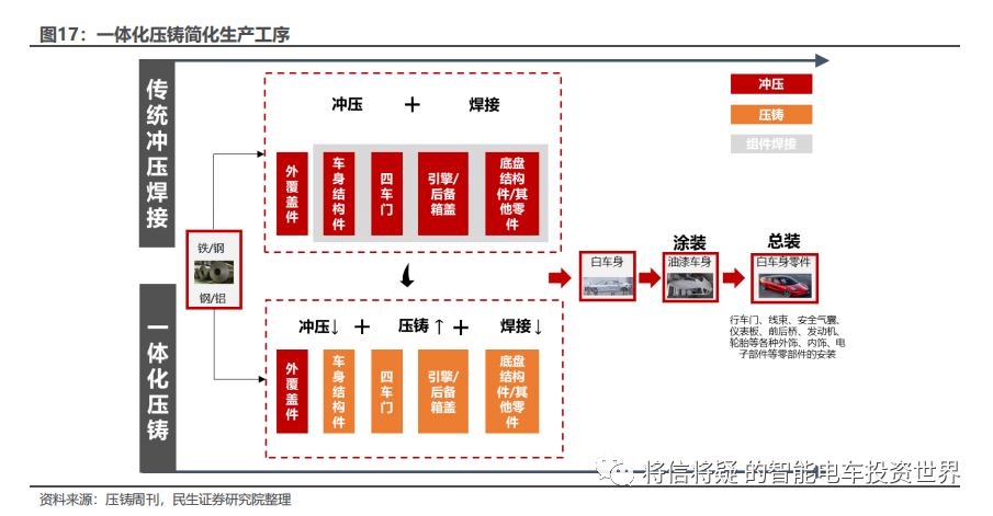 大尺寸铝合金压铸件催生一体化压铸工艺。轻量化提升铝合金用量,顺应趋势,铝合金压铸件尺寸越做越大。但由于铝合金具有热膨胀系数较高、熔点低、易氧化等特点,采用传统冲焊工艺存在的热输入过大引起变形、气孔、焊接接头系数低等问题被放大,旧工艺下铝合金成本高效率低,一体化压铸应时而生。一体化压铸将大型结构件中原本需要组装的多个独立的零件重新设计,并使用超大型压铸机一次压铸成型,直接获得完整的零部件,大幅减少冲压及焊接流程,优化了结构件性能,有望加快铝合金渗透。