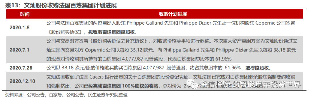 收购全球领先的铝合金压铸件生产企业法国百炼集团。法国百炼集团成立于1994年1月6日,于1999年在巴黎泛欧交易所挂牌交易,是汽车零部件铝合金铸件领域的全球性龙头企业,汽车制动系统的精密铝合金铸件领域世界领导者,总部位于法国波尔多。2019年,公司与百炼集团达成收购协议,计划以2.397亿欧元的价格收购百炼集团100%股权,2020年7月28日,完成百炼集团61.34%股份的收购,截至2020年12月10日,文灿法国持有百炼集团100%股份,并购完成。