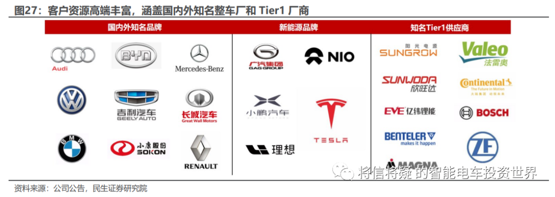 公司客户资源高端丰富,涵盖国内外知名整车厂和Tier1厂商。公司依托技术研发、产品质量管理等方面的综合优势,与国内外知名汽车整车厂商及一级零部件供应商建立了稳固的合作关系,如大众、奔驰、宝马、奥迪、雷诺等国际知名整车厂商,特斯拉、蔚来汽车、理想汽车、小鹏汽车、广汽新能源等新能源汽车厂商,比亚迪、吉利、长城汽车、小康股份等国内知名整车厂商,以及采埃孚、博世、大陆、麦格纳、法雷奥、本特勒等全球知名Tier1汽车零部件供应商。同时,公司在2021年与亿纬锂能、欣旺达及阳光电源等知名电池厂商建立了合作关系,新能源客户重要性逐步提升。