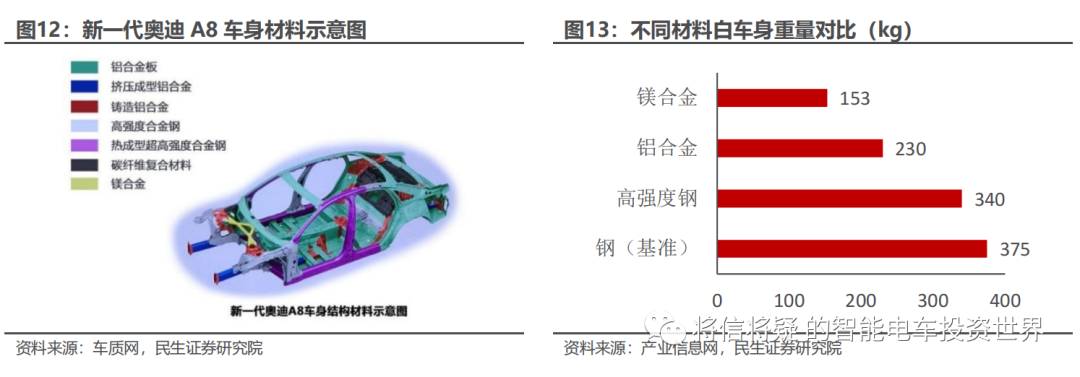 轻量化材料势在必行,轻金属用量持续提升,均衡成本与收益是关键。轻金属及复合材料价格相对钢铁更加昂贵,大量使用会带来成本的上升,以白车身为例,钢车身重量在375kg左右,假设钢价为5元/kg(参考爱采购钢价),白车身材料价格约为1875元;如果使用铝合金代替钢,其重量为230kg,减重比例接近40%,以20元/kg(参考爱采购铝合金价)的价格计算,白车身材料价格约为4600元。因此,厂商需综合考虑使用轻量化材料带来的成本上升,以及由于重量下降带来的收益。