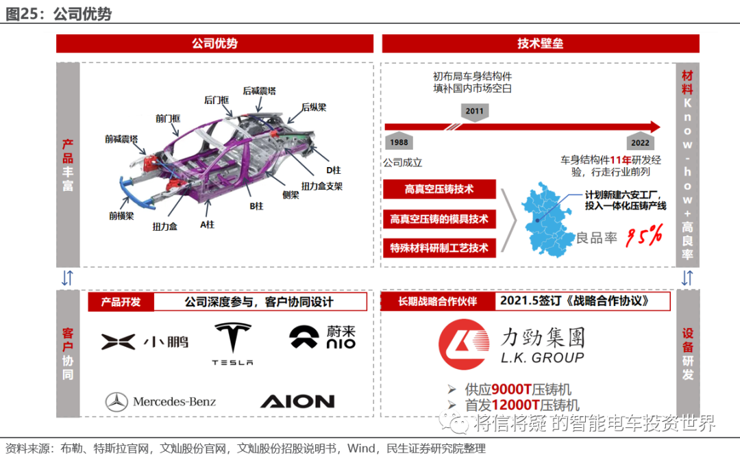 2)设备及材料:公司与压铸机供应商力劲集团建立长期战略合作关系,于2021年5月签订了《战略合作协议》,通过双方资源共享,共同为下游客户提供一体化铸造产品解决方案;2022年5月,“立中-文灿及现有客户”的行业联盟建立,其中,文灿与力劲继续深化大型压铸单元战略合作,立中与文灿签署战略合作框架协议,计划在电动车大型一体化车身结构件、一体化铸造电池盒箱体等产品的材料、工艺应用领域建立战略合作关系。