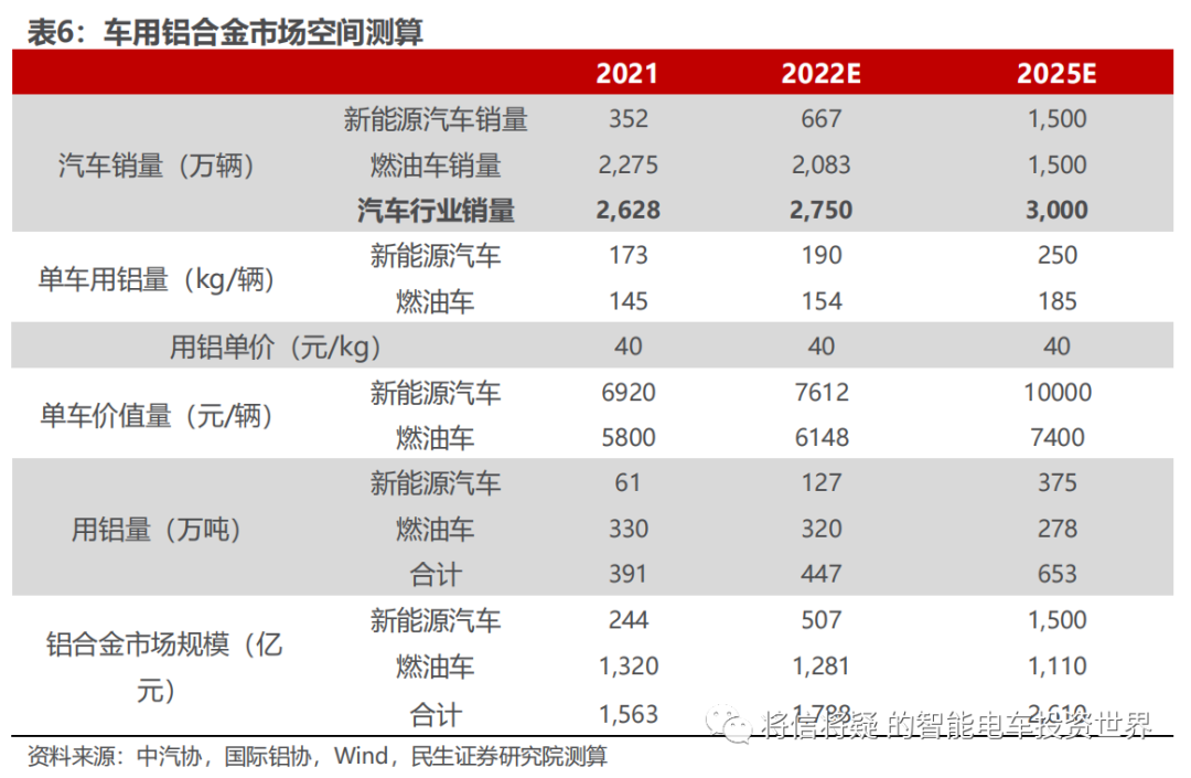 新能源车市场高速发展,拉动车用铝合金市场规模快速增长,公司作为领先企业将充分受益。假设用铝单价不变,结合我们的汽车销量测算,得到2025年国内汽车用铝量有望达653万吨,汽车铝合金市场规模有望达2610亿元,较2021年增长67%,公司作为铝压铸企业,将充分受益。