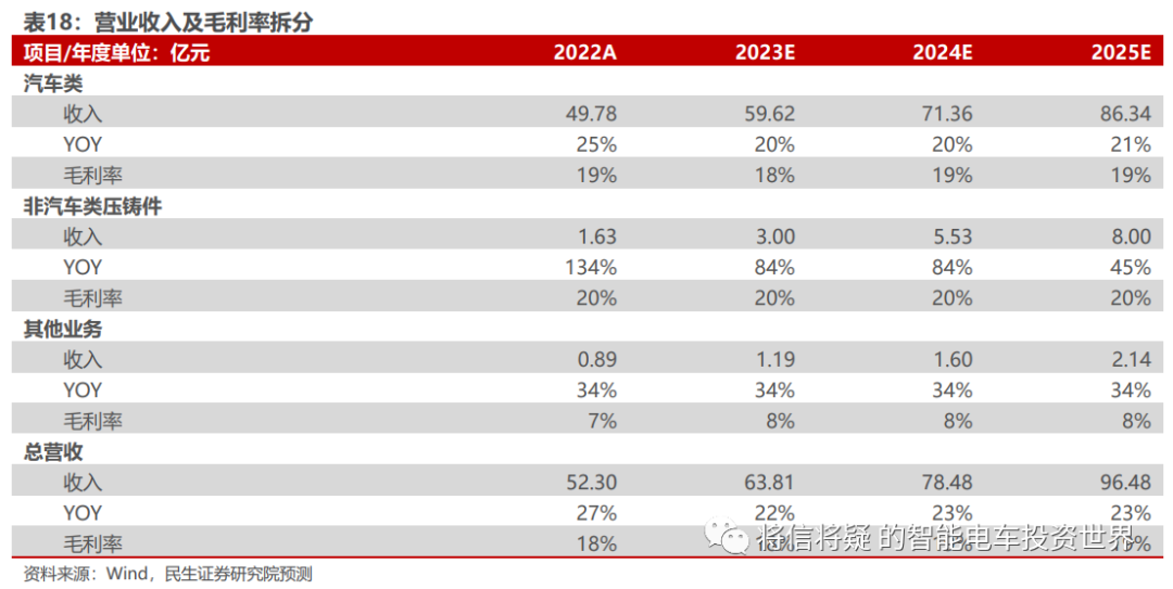 2)非汽车类压铸件:非汽车类压铸件主要包括游艇驱动轴壳体、游艇发动机盖、储能电池盒等,公司2021年获取的储能电池盒项目在22H1已量产,目前该业务处于快速增长阶段。2021-2022年该业务营收平均增速为74%,我们预计公司该业务2023-2025年营收增速分别为84%/84%/45%;考虑到公司该业务产能持续投入,叠加规模化效应,毛利率有望平稳在20%。
