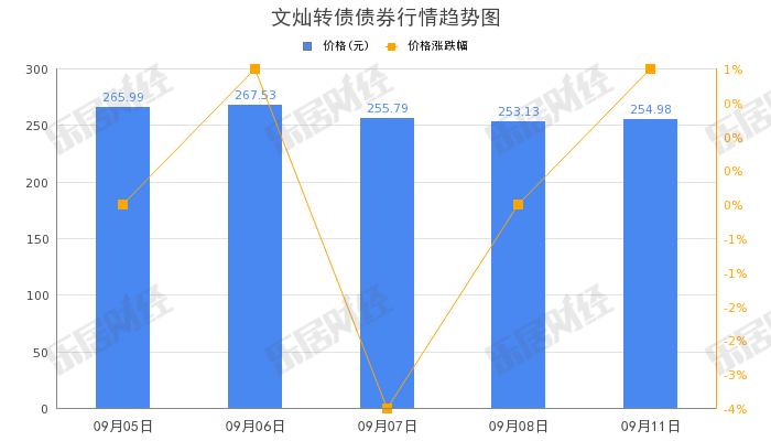乐居财经 09月12日,“文灿转债”(113537)早盘拉高,截至11:10,涨幅14.75%,报292.60元。总成交量70.09万手,成交额19.43亿元。