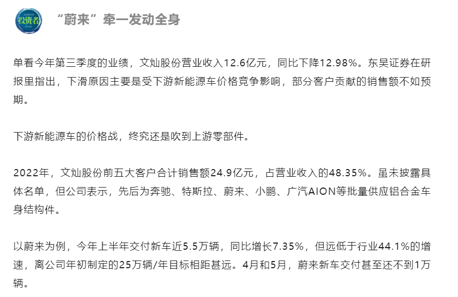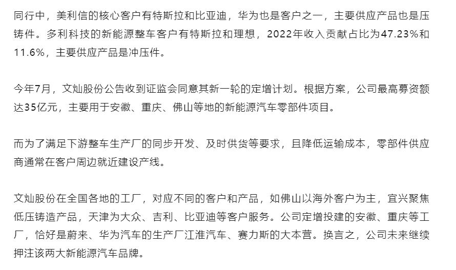 文灿股份2023年前三季度营收约38.2亿元,同比减少1.75%;归属于上市公司股东的净利润约4970万元,同比减少80.78%。其中,三季度单季实现营业收入12.59亿元,同比减少12.98%,归母净利润0.36亿元,同比减少70.78%。业绩下滑,公司将原因归结于两方面。其一,部分新能源车客户产品收入未达预期,导致未充分发挥规模量产效应,影响短期盈利能力。其二,百炼集团人工薪酬、质量、能源等成本增加,以及原材料价格波动造成利润减少。