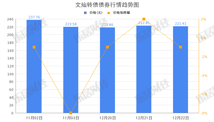 乐居财经 12月25日,“文灿转债”(113537)早盘拉高,截至11:10,涨幅12.17%,报248.37元。总成交量54.66万手,成交额13.19亿元。