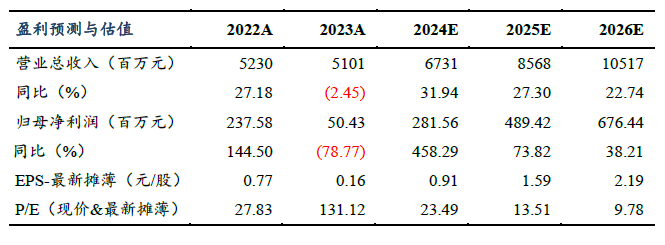 考虑到公司海外经营改善节奏+新项目放量节奏等因素,我们将公司2024-2026年归母净利润的预测调整为2.82亿元、4.89亿元、6.76亿元(前值为4.01亿元、5.83亿元、6.85亿元),对应2024-2026年EPS分别为0.91元、1.59元、2.19元(前值为1.52元、2.21元、2.60元),市盈率分别为23.49倍、13.51倍、9.78倍,考虑到公司大型一体化结构件发展空间广阔,维持“买入”评级。