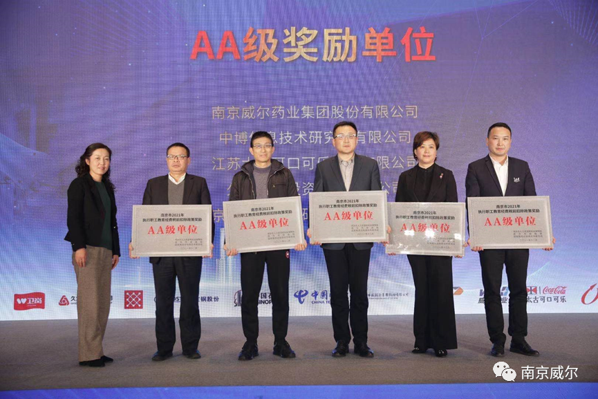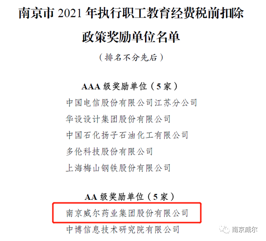 根据《关于印关于落实我市三年职业技能提升行动的若干措施的通知》(宁人社规【2020】2号)文要求,全南京市共有53家企业自主申报,经过区级初审推荐、市级复审、专家评审、信用核查和公示等程序,最终确定19家企业获得2021年执行职工教育经费税前扣除政策奖励,通过率35.8%,其中5家AAA级单位,5家AA级单位,9家A级单位。南京威尔药业集团从众多企业中脱颖而出,名列前茅,获得AA级单位的荣誉,这也是市政府对集团公司培训基础能力建设投入、技术技能人才培养等方面突出表现的充分肯定。