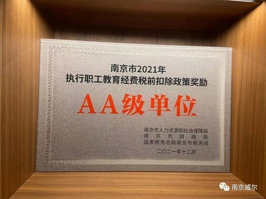 近日,南京市人力资源与社会保障局公布了2021年南京市企业执行职工教育经费税前扣除政策奖励名单,集团被评为南京市2021年执行职工教育经费税前扣除政策奖励AA级单位。